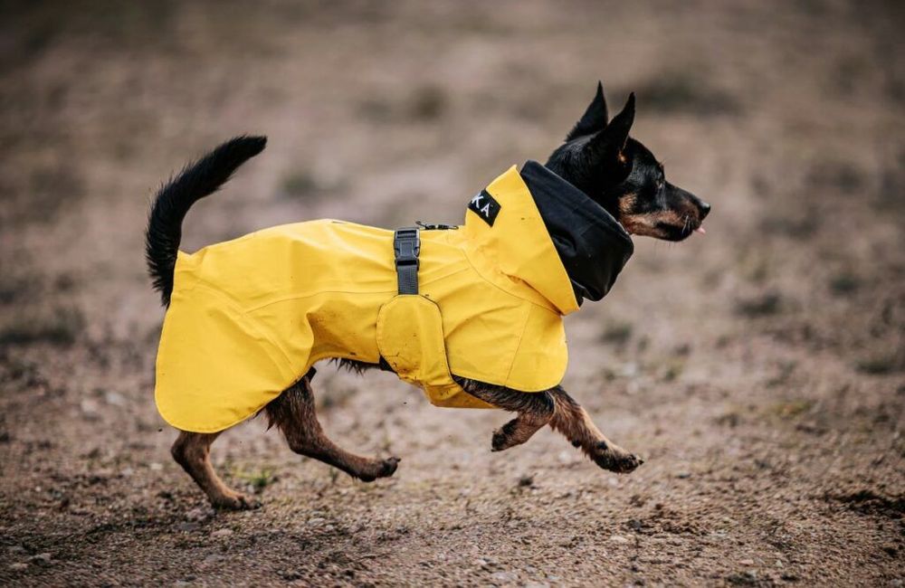 Dežni plašč je v celoti odseven, nepremočljiv, z odprtino za oprsnico na zadrgo in razpoko pri repu, da ne omejuje gibanja repa, kar lahko negativno vpliva in preprečuje psu komunikacijo z drugimi psi, ko je oblečen. Obenem je zasnovan tako, da v celoti pokrije prsni koš z nastavljivim paščkom na zatič, kroj zadaj pa seže skoraj do kolen, da pokrije celoten kožuh in stegna tudi med gibanjem. Ovratnik lahko prilagajamo in mu po potrebi tudi zmanjšamo obseg, kar pride še kako prav v dežju ali vetrovnem vremenu. V sprednjem delu je kroj razpolovljen v nivoju ključnice na dva dela; z namenom, da kroj in rokava ne ovirata gibanja sprednjih nog, kar posledično lahko vodi do omejevanja koraka kar vpliva na celotno pasje gibanje, ki lahko vodi v nelagodje.