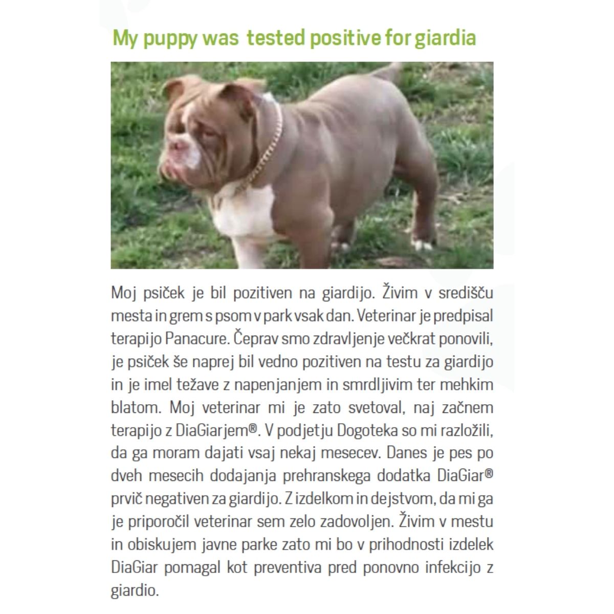 Tablete DiaGiar® vsebujejo mešanico eteričnih olj in drugih naravnih sestavin, ki ohranjajo fiziološko črevesno zdravje. Imajo antiseptičen, antidispeptičen in antioksidativen učinek na prebavila. Kadar se pojavi okužba z giardio se jemlje dopolnilo DiaGiar® skupaj z zdravilom vse dokler pozitivnost ne izgine. V primeru uporabe brez zdravila bo zdravljenje daljše, tudi do več mesecev. Preventivno je priporočljivo dodajati DiaGiar® ciklično, zlasti na območjih z visoko prisotnostjo giardije in v spomladansko-poletnih obdobjih.