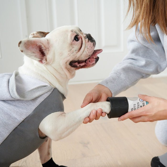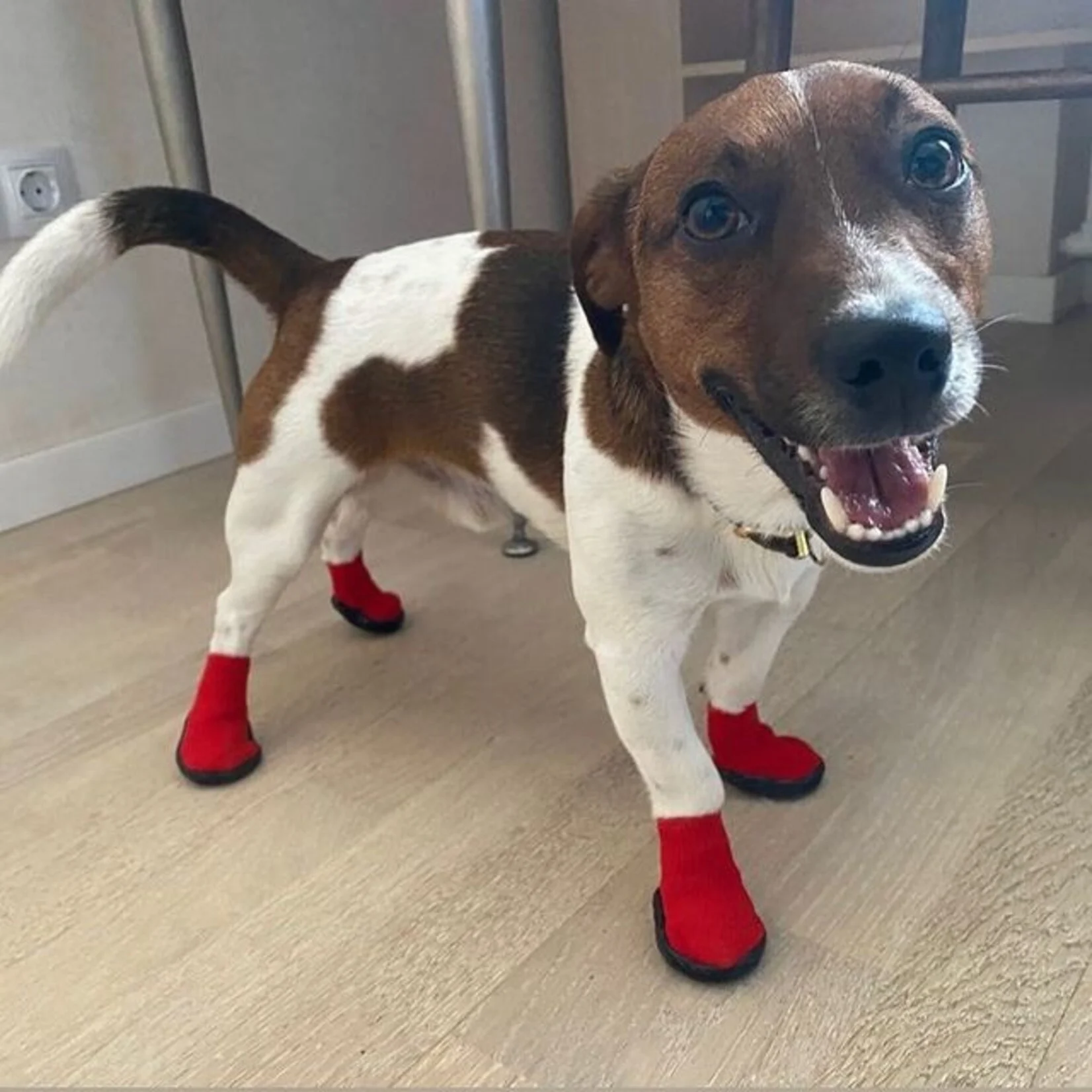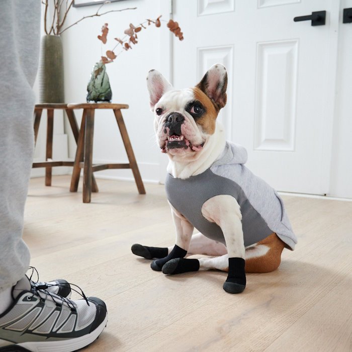 - Zunanja rebrasta tkanina se raztegne kar do trikrat, kar skrbnikom omogoča enostavno obuvanje – za še lažje obuvanje si lahko pomagate tudi z originalno embalažo okoli katere po robu napnete nogavico v notranjost in pasjo tačko vstavite vanjo (kako točno, si lahko pogledate predlog v videoposnetku).