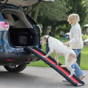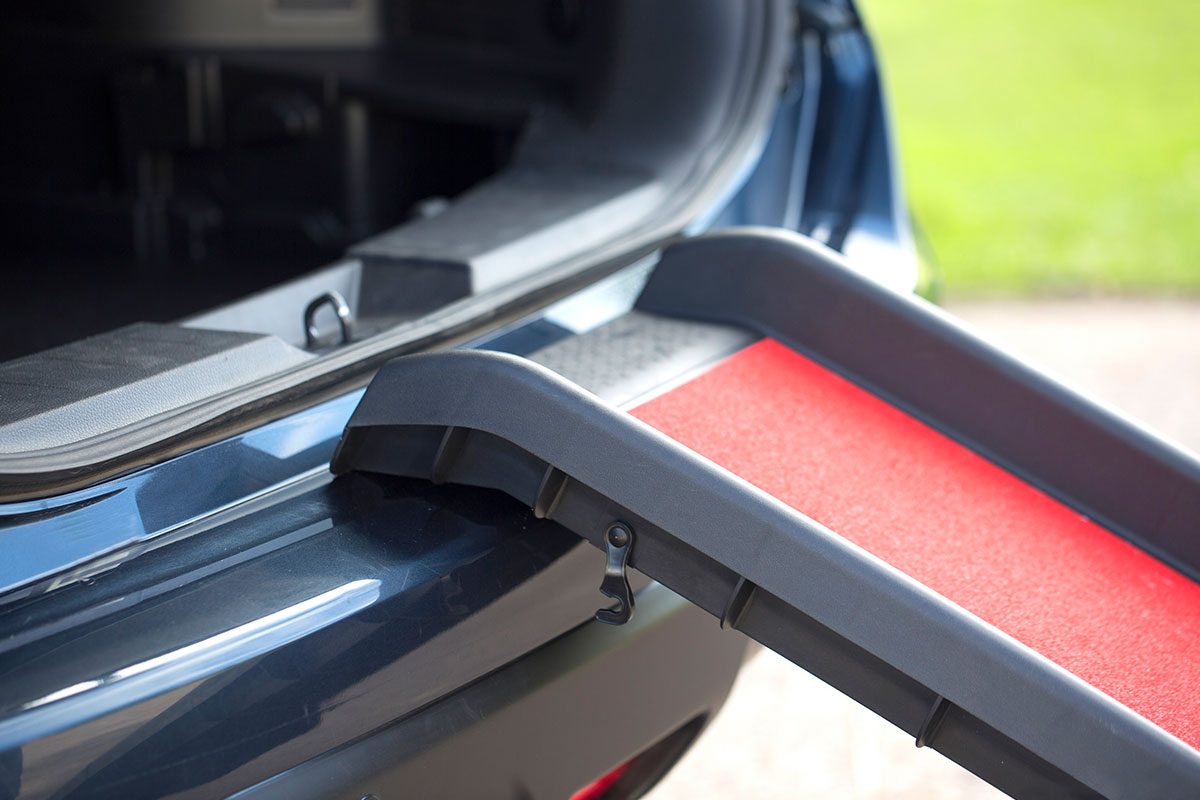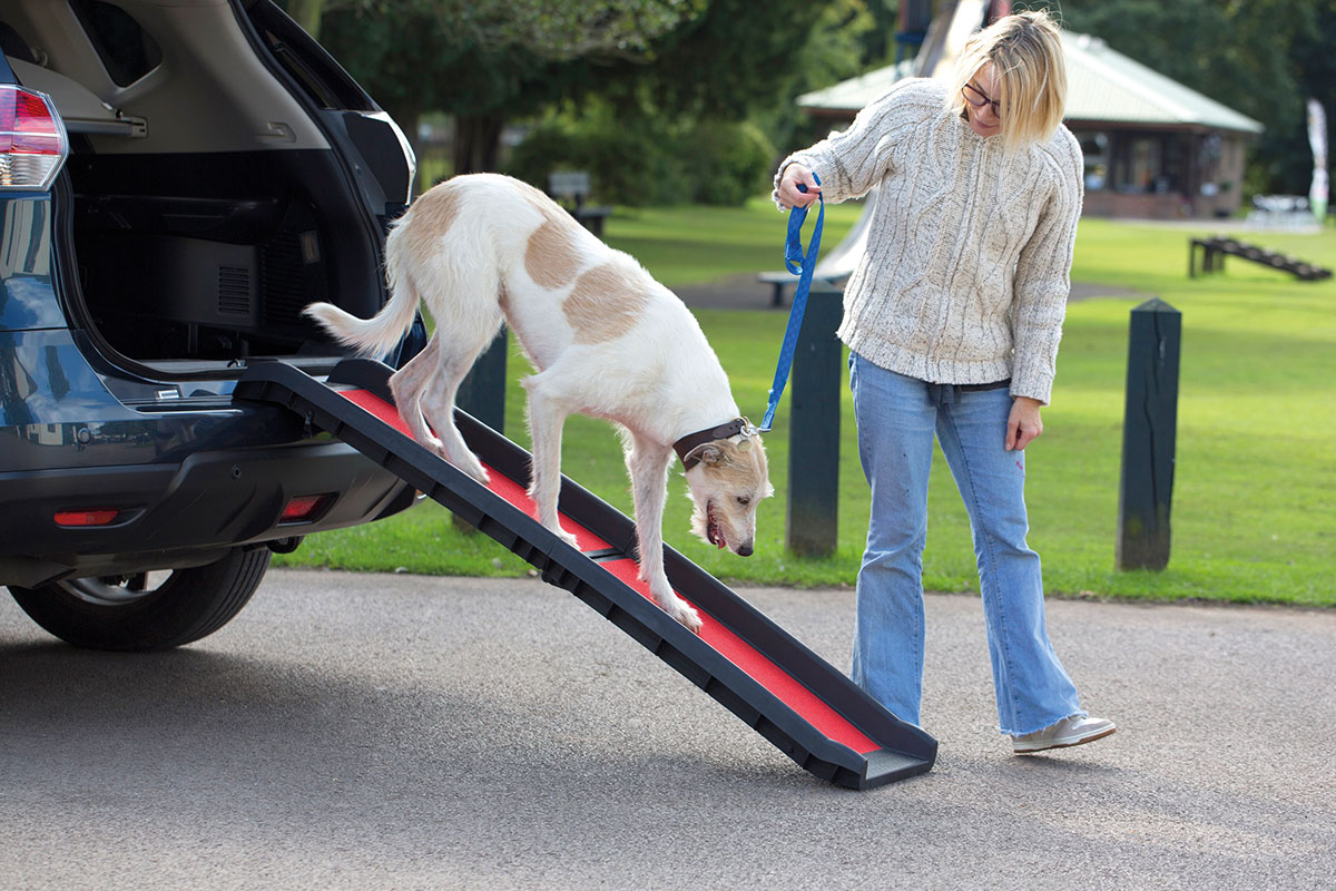 Lahka zložljiva rampa psu omogoča lahek, neboleč dostop do vozila – namesto skoka, se pes do svojega mesta enostavno sprehodi. Zlasti jo priporočamo za starejše, bolne pse, pse večjih pasem, ki so genetsko podvrženi težavam s skeletom, tistim, ki okrevajo po kirurških posegih ali pa jim skoki v in iz vozila niso ljubi (zaradi bolečin).