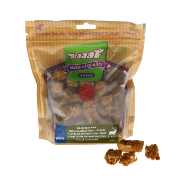 Mesne kocke so 100% naravni prigrizek iz jelenjega mesa. Super so za nagrado pri šolanju, pa tudi kot priboljšek med obroki, saj so dober vir beljakovin. Ker je meso sušeno na nizki temperaturi, so ohranjena skoraj vsa hranila, arome in okusi. Ker je alergija na divjačino zelo redka, so primerne tudi za alergike.