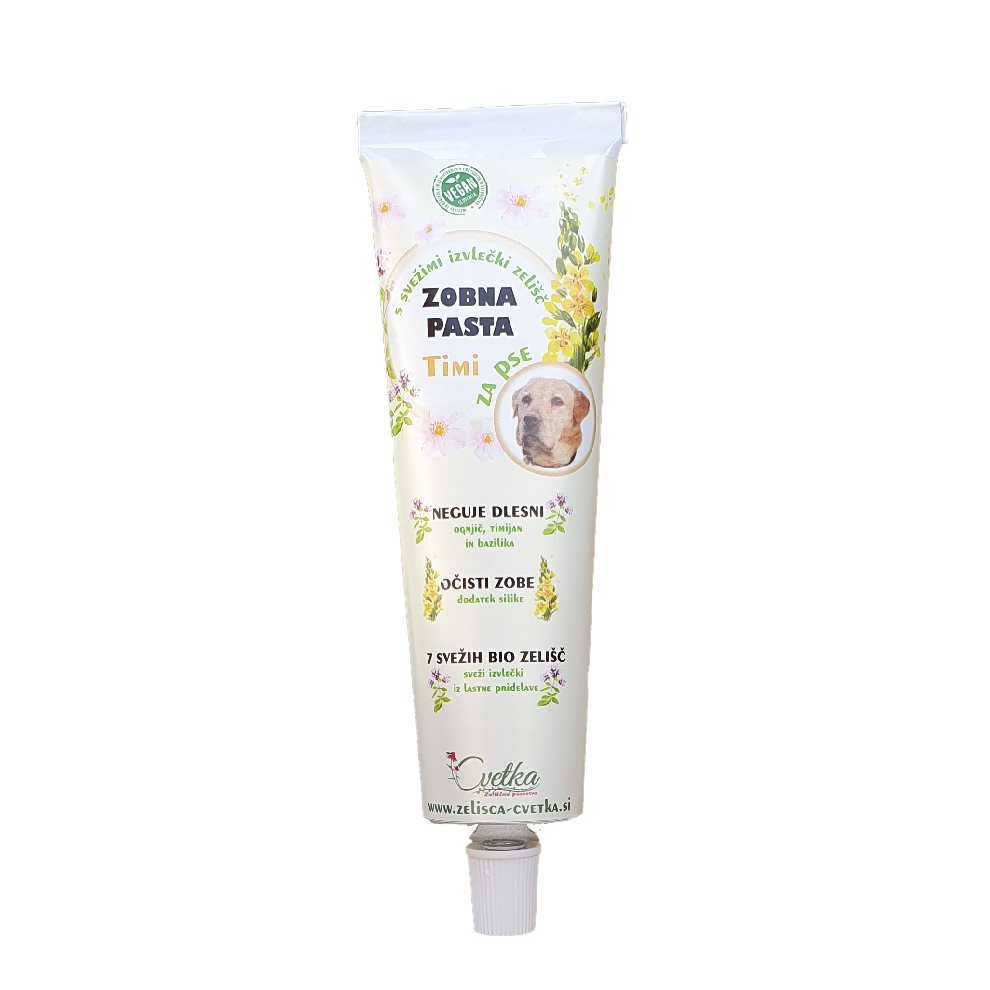Zelišča, strokovno pripravljeni izvlečki 5 ekoloških zelišč iz lastne pridelave, poskrbijo za svež dah in zdravo ustno votlino. Zobno pasto naneseš na prst ali zobno ščetko in zdrgneš zobe. Ostanke očistiš z vlažno krpo, nič hudega pa ni, če kuža zobno pasto tudi poliže. ;)