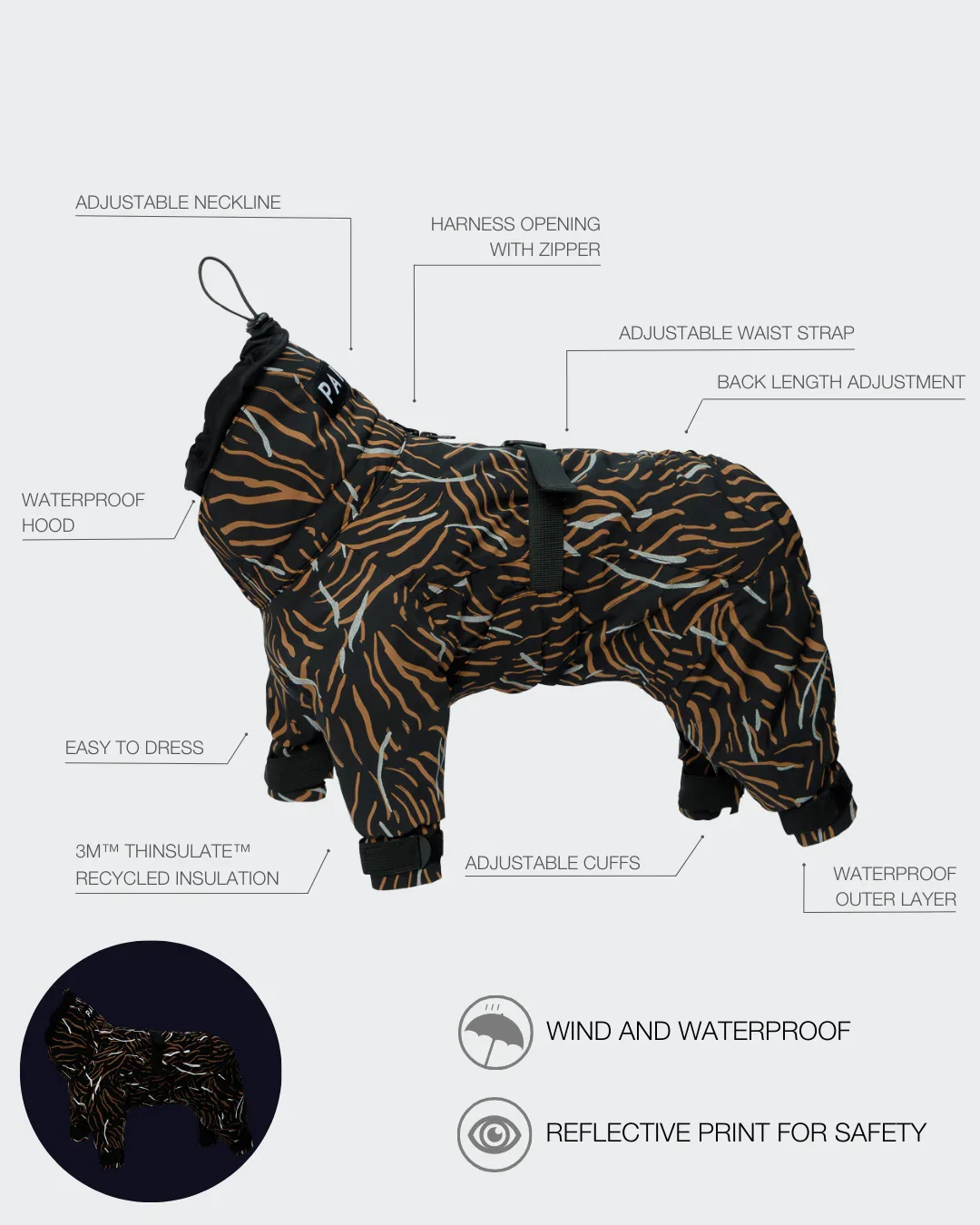 Nepremočljiv pasji kombinezon s toplo podlogo, ki ga je enostavno slačiti in oblačiti. Kaj boljšega si lahko želimo skrbniki psa, ki se ne mara oblačiti a ga zebe?