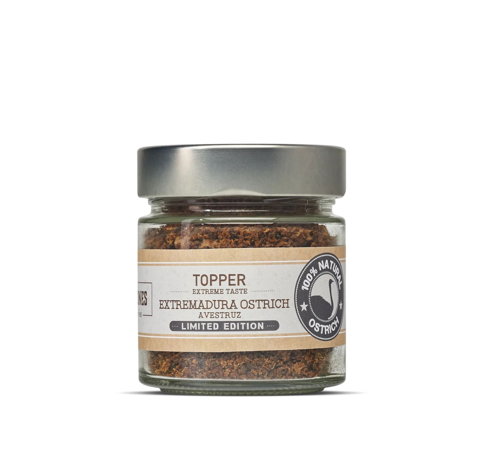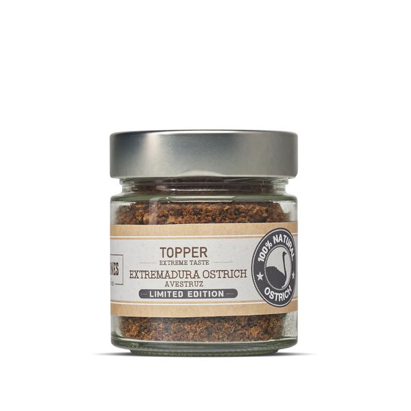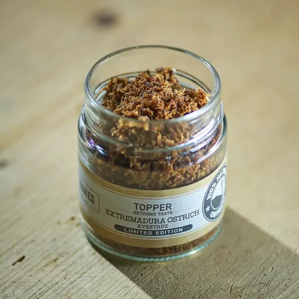Nojev posip je 100 % naravno dopolnilo k hrani za pse, ki obogati vsak obrok z visoko kakovostnimi beljakovinami in zdravimi maščobami. Pridobljen je iz mesa nojev, vzrejenih prosto v naravi v Extremaduri, kar odraža našo zavezanost lokalnim sestavinam ter odgovorni in trajnostni reji.