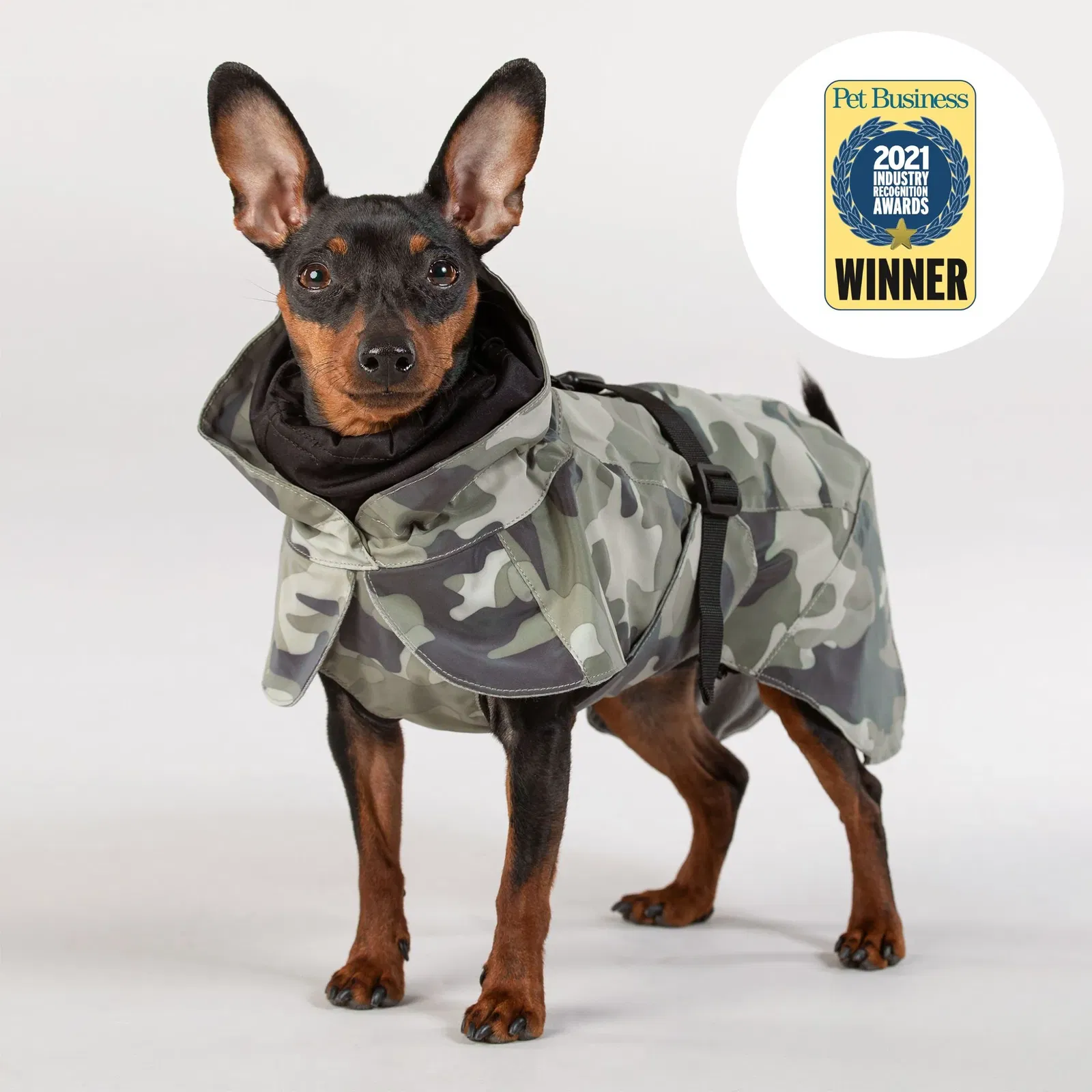 Najboljši dežni plašč za pse; jakna, ki je v celoti odsevna, nepremočljiva, z odprtino za oprsnico na zadrgo in razpoko pri repu, da ne omejuje gibanja repa, kar lahko negativno vpliva in preprečuje psu komunikacijo z drugimi psi, ko je oblečen. Obenem je ta pasji dežni plašč zasnovan tako, da v celoti pokrije prsni koš z nastavljivim paščkom na zatič, kroj zadaj pa seže skoraj do kolen, da pokrije celoten kožuh in stegna tudi med gibanjem.
