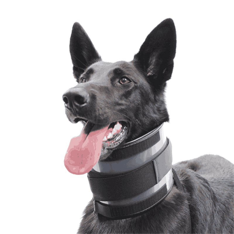 Zaščitni ovratnik je izdelan iz prožne plastike in elastičnega povoja, ki se zapenja z velcro trakovi. Na voljo je tudi pas za ovijanje prsnega koša psa, da se izognemo temu, da bi se ovratnica obračala okoli glave.
