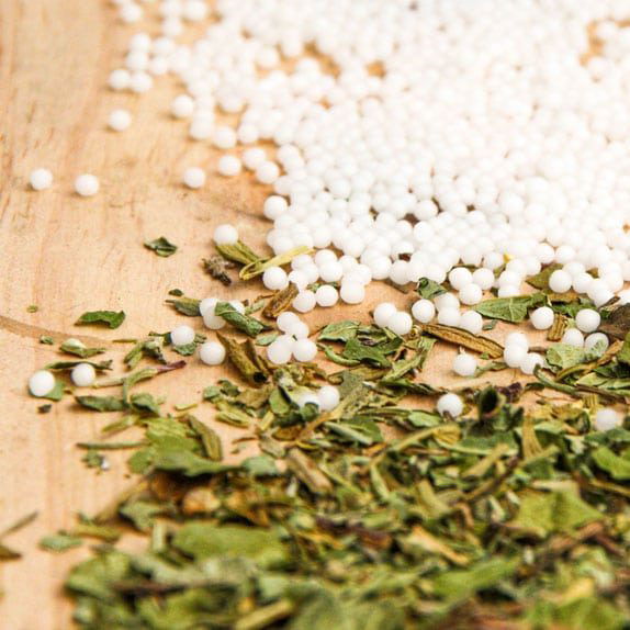 • kroglice čiste sukroze (brez laktoze), ki so impregnirane s hidroalkoholnimi ekstrakti rastlin: